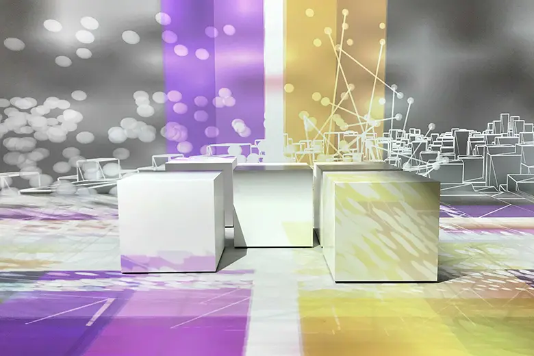 自動で動く5つの立方体の動きと、ダンサーとのパフォーマンス、バーチャル空間の映像と組み合わされた作品でした。