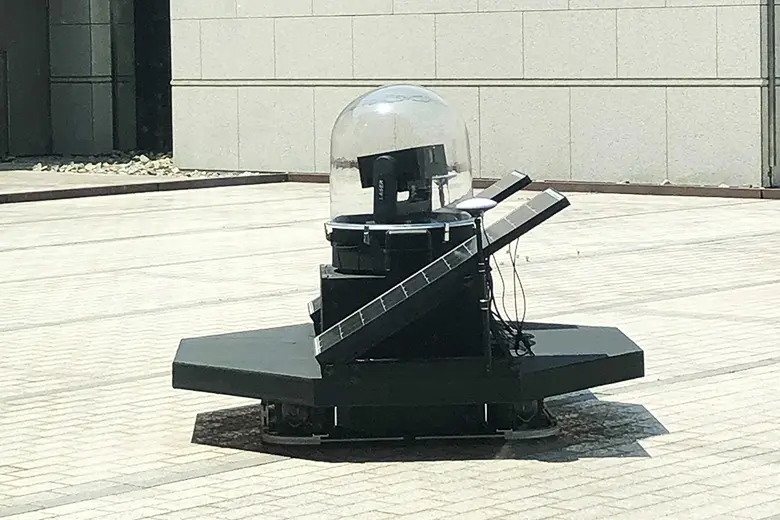 中庭にはソーラーパネル発電で自動で動いているロボットがいました。