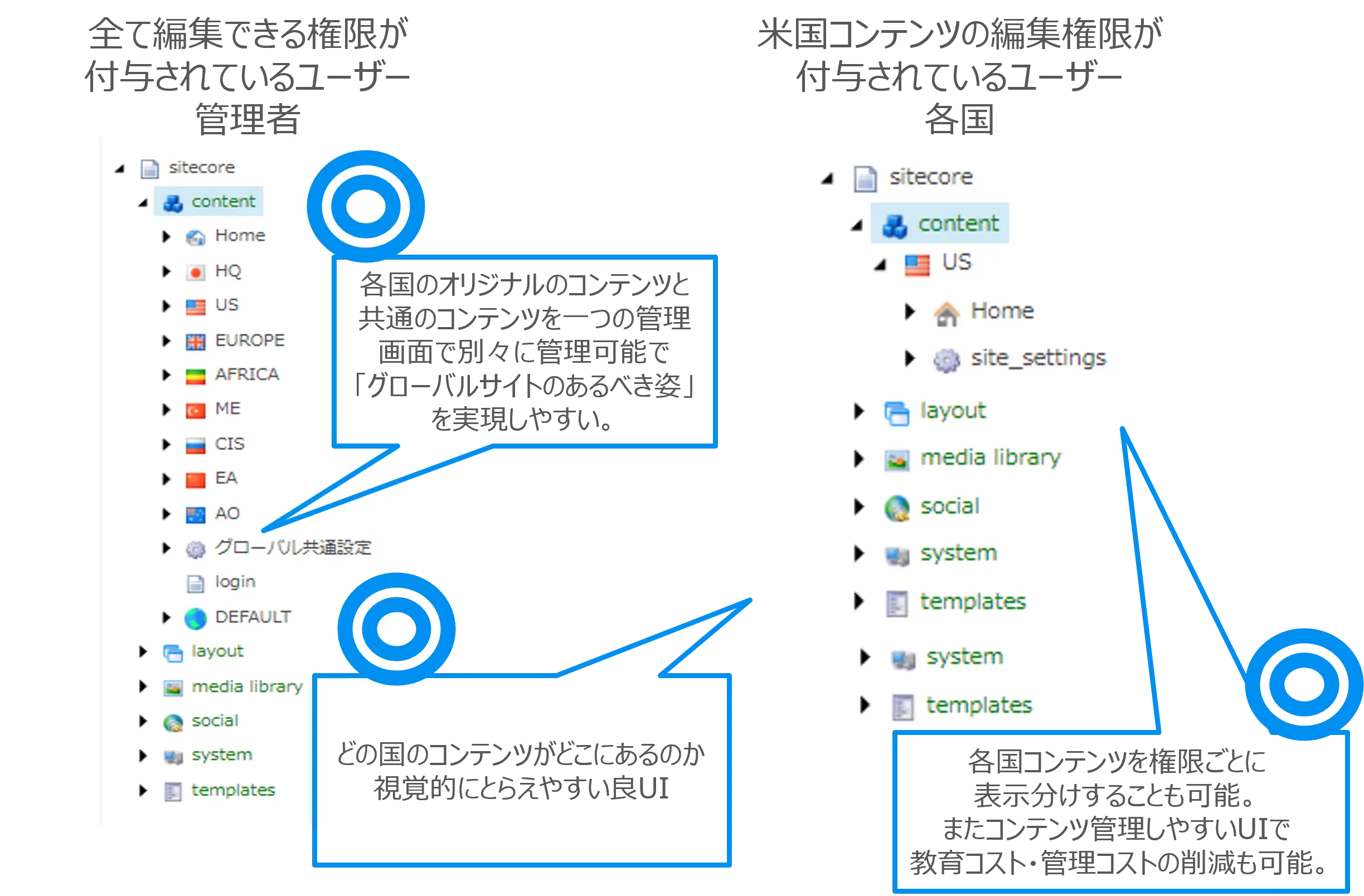 Sitecoreは複数のWebサイトを1つのインスタンスで管理することができます。各国のオリジナルのコンテンツと共通のコンテンツを一つの管理画面で別々に管理可能で「グローバルサイトのあるべき姿」を実現しやすいです。 - 細やかな権限設定が可能