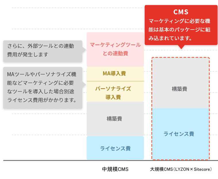 コスト構造を図にして比較してみると、下図のように中小規模のCMSでは別途機能ごとに費用が発生する場合があることが分かります。長期運用を前提として、機能の取捨選択や、CMSの規模を検討することが大事になります。