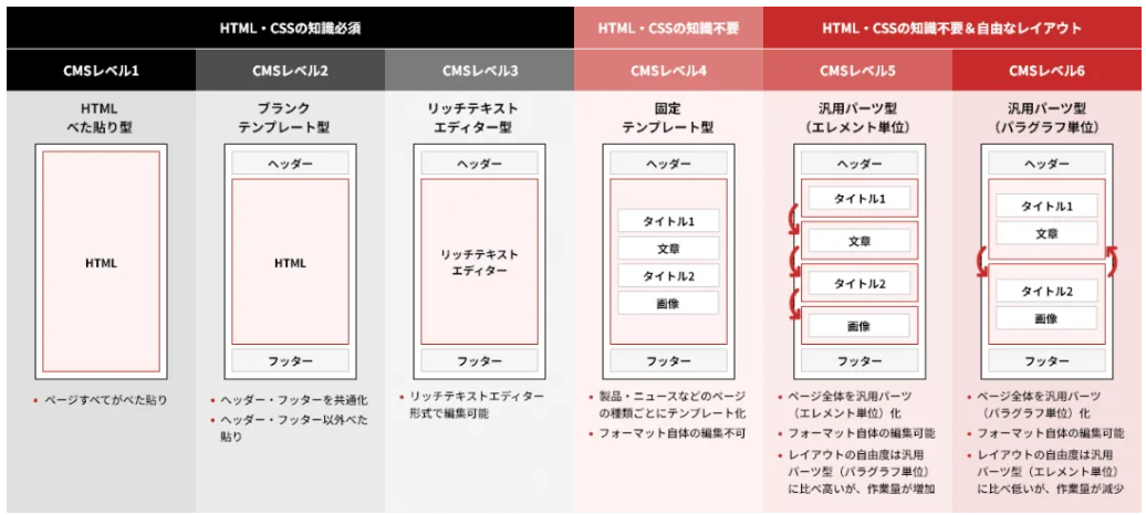 さらに下図のように、CMSのレベルによって操作性や運用効率に違いがあります。