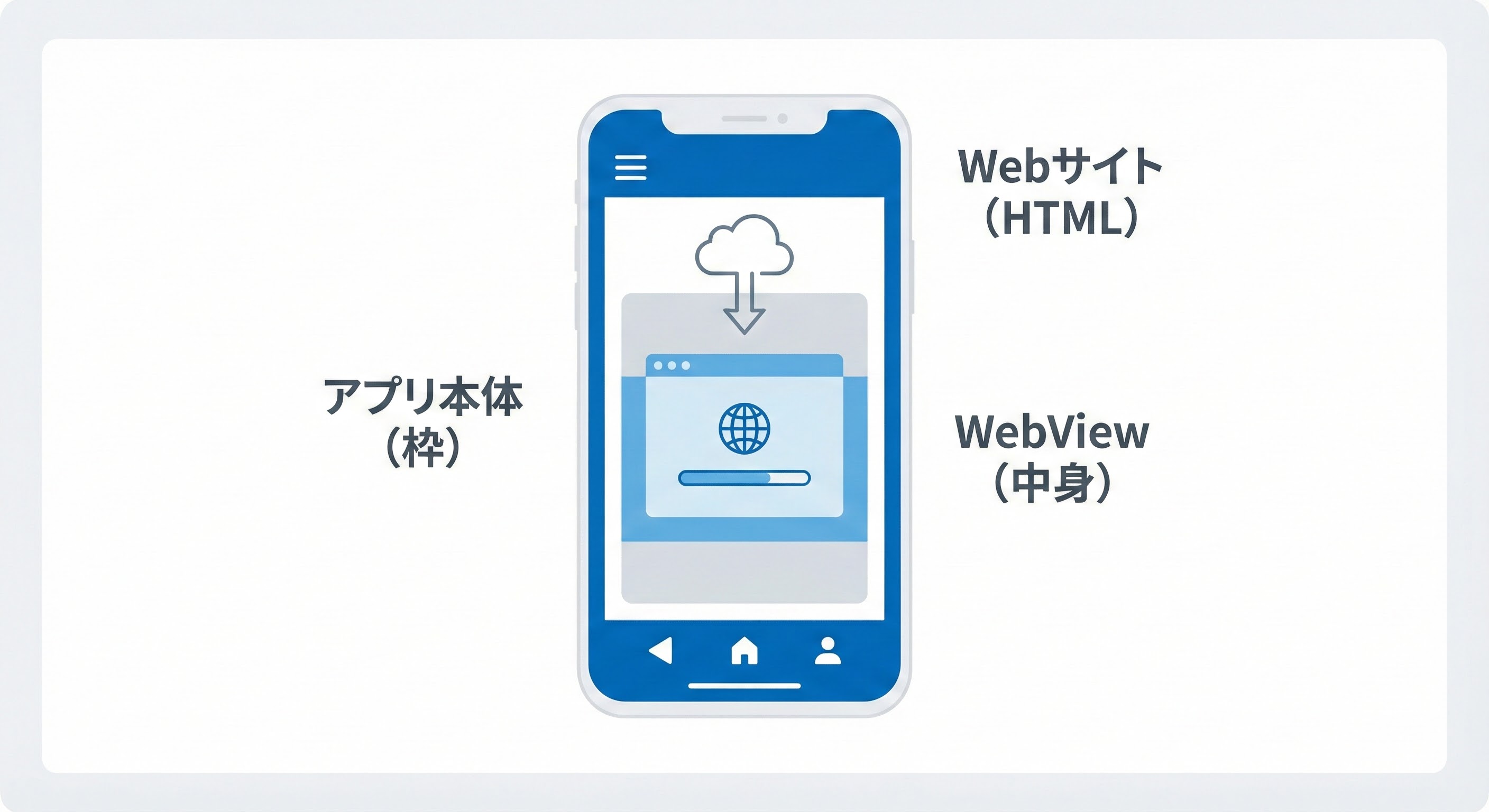 A. WebViewアプリは、アプリ本体が「ログインやメニューなどの枠」を持ち、中身はWebサイト(HTML)をアプリ内で表示する構成のことです。「アプリの中に“ブラウザの窓”を埋め込む」イメージが近いです。