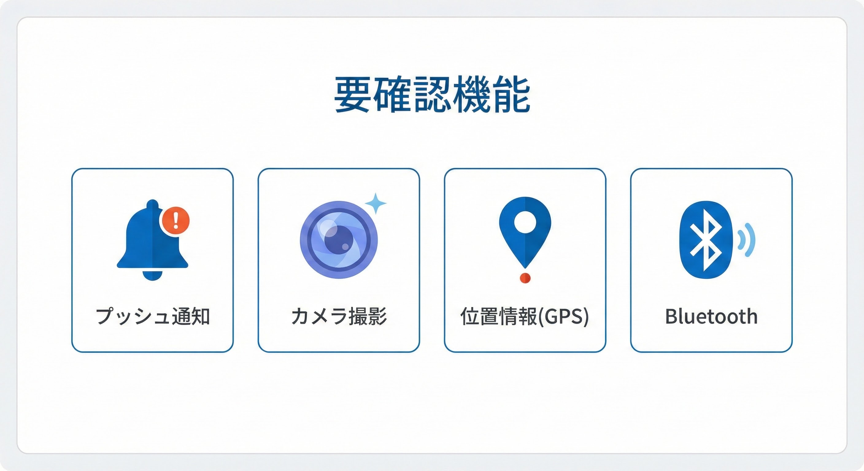 - 「通知」「カメラ」「位置情報」などの利用は想定しているか?