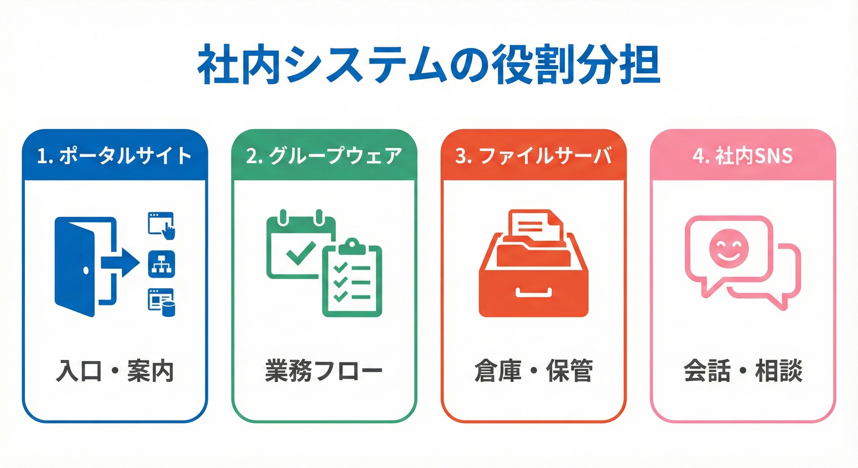 ポータルだけを単独で考えるのではなく、社内システム全体の役割分担の中で位置づけることが重要です。
