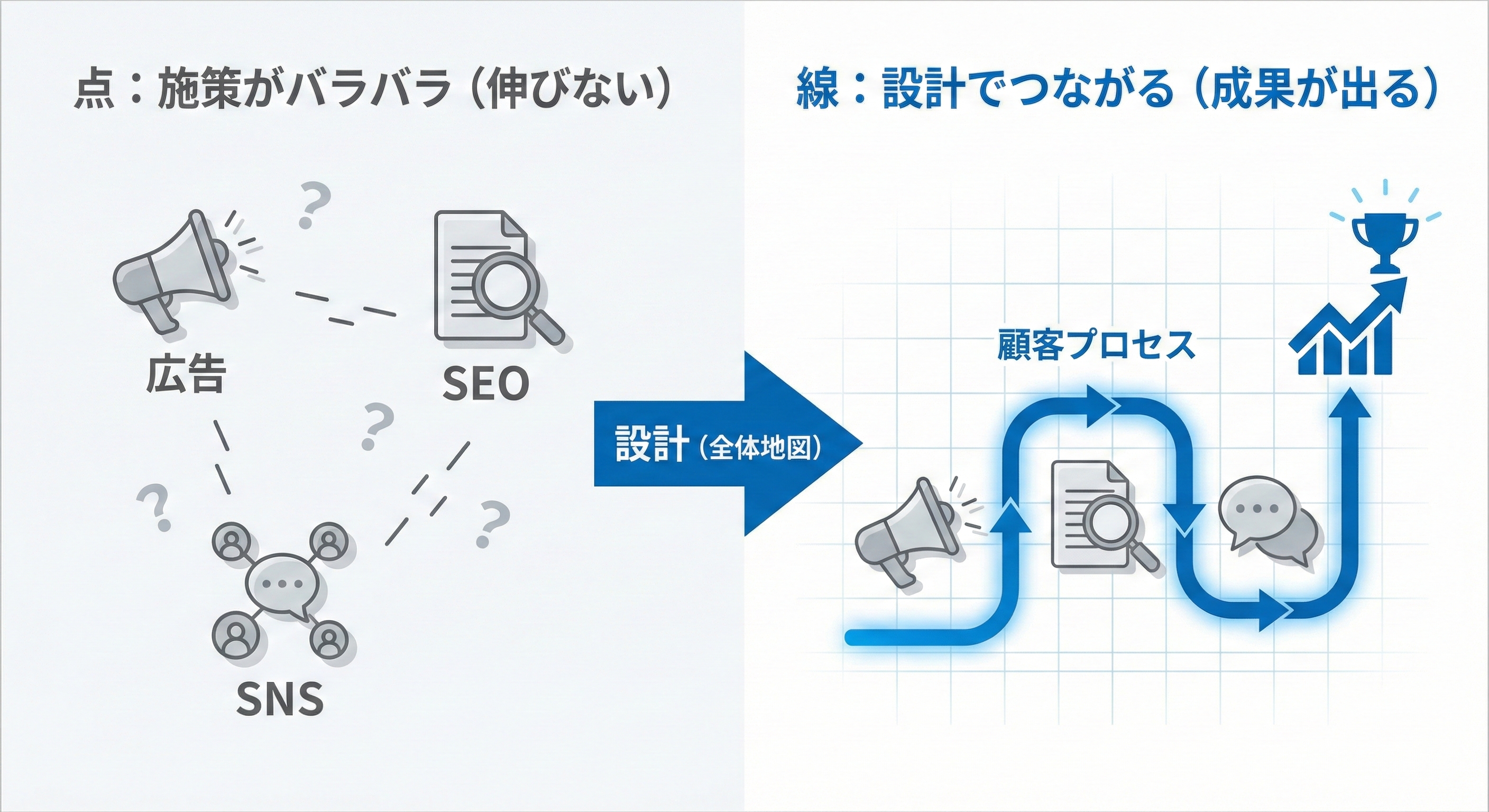 伸びない状態の正体は、担当者がサボっていることでも、施策の知識が足りないことでもありません。多くの場合、施策が「点」で存在しているだけで、顧客の意思決定プロセスに沿った「線」になっていないことが原因です。