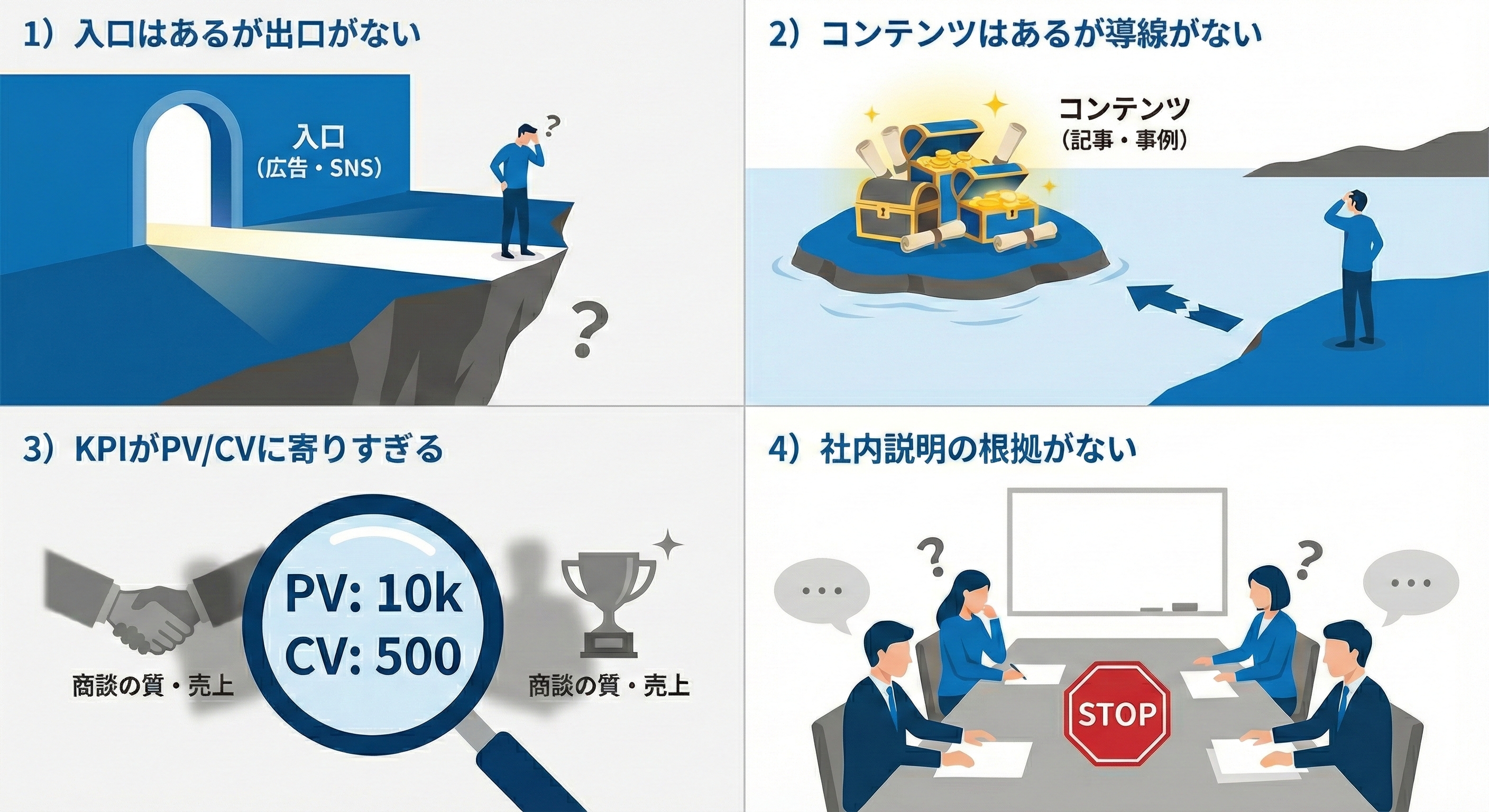 広告やSNSで流入は作れるのに、比較・検討に必要なページ(事例、FAQ、選定ポイントなど)が不足しているケースです。ユーザーは「結局、自社に合うのか」を判断できず、離脱します。