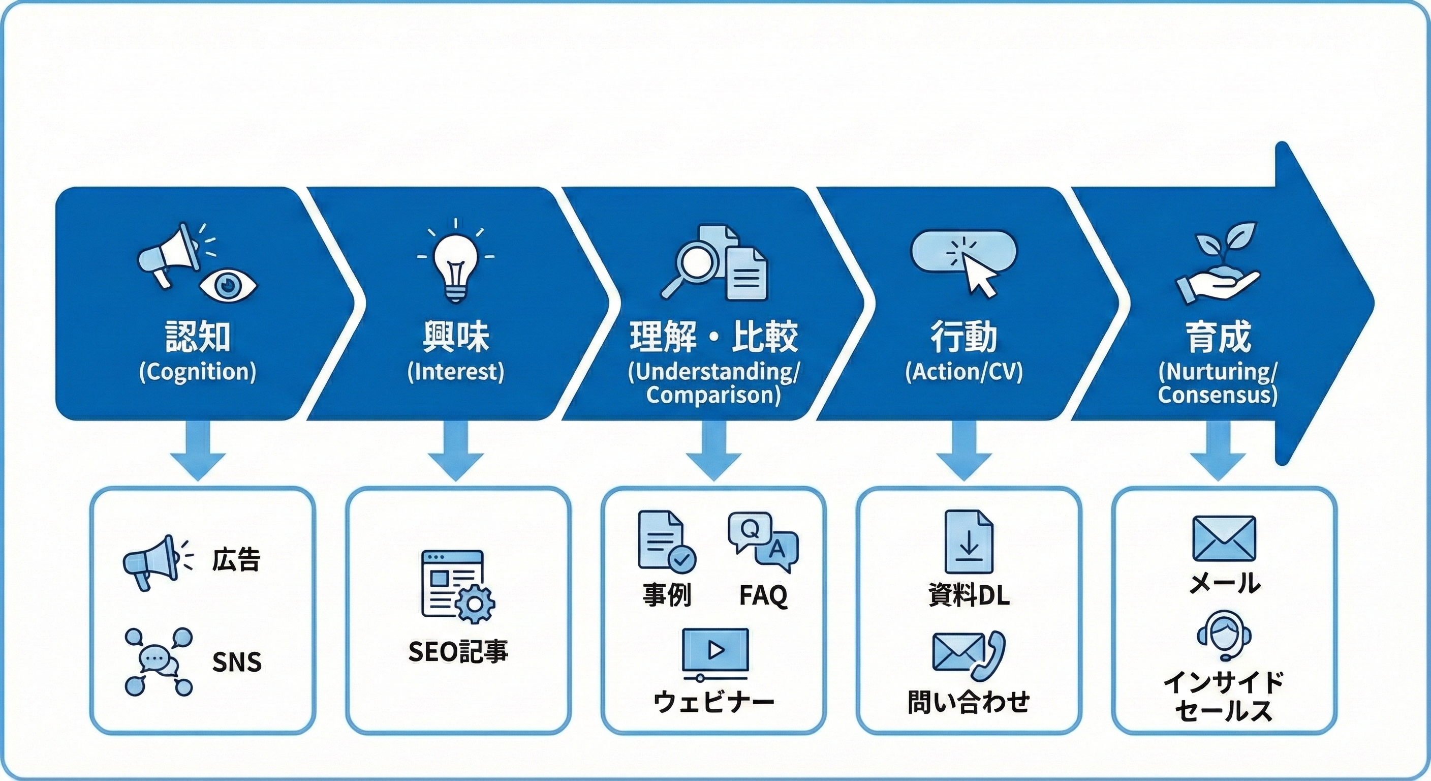 例:認知→興味→理解→比較→行動(問い合わせ)→育成(稟議・合意形成)