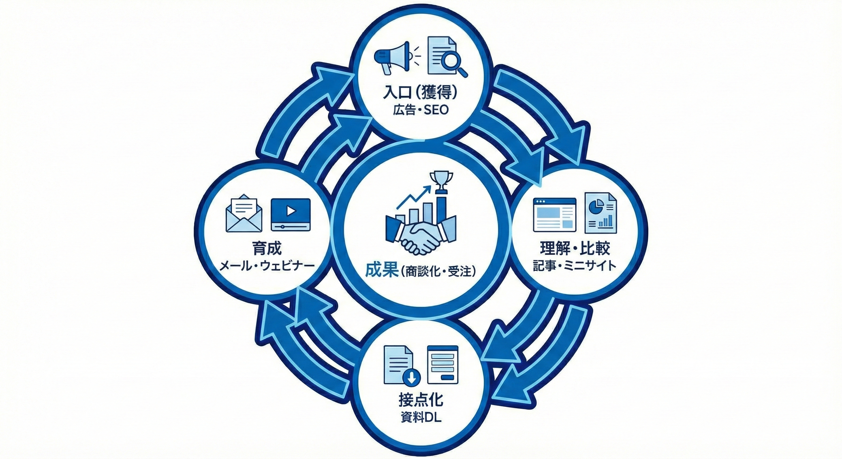 例:広告で入口を作る→記事/ミニサイトで理解と比較を支える→資料DLで接点化→メールで育成→相談へ。