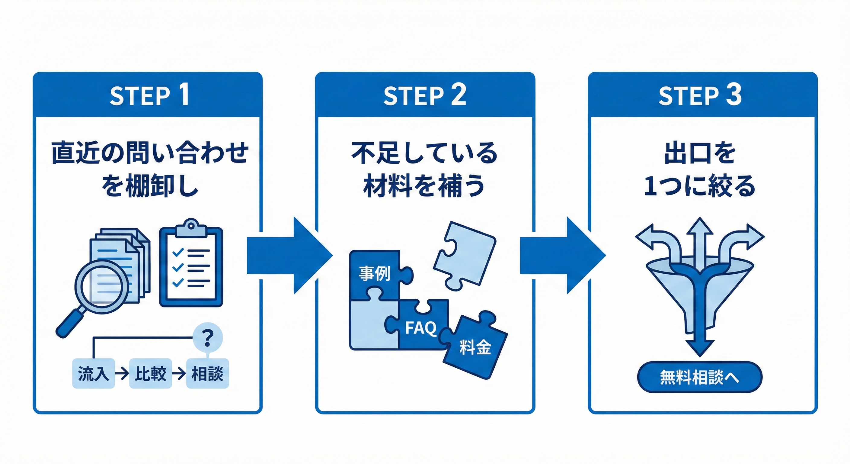 ここができると、「今の弱点は比較材料の不足だから、先に事例とFAQを整えよう」といったように、次の一手が自然に決まります。