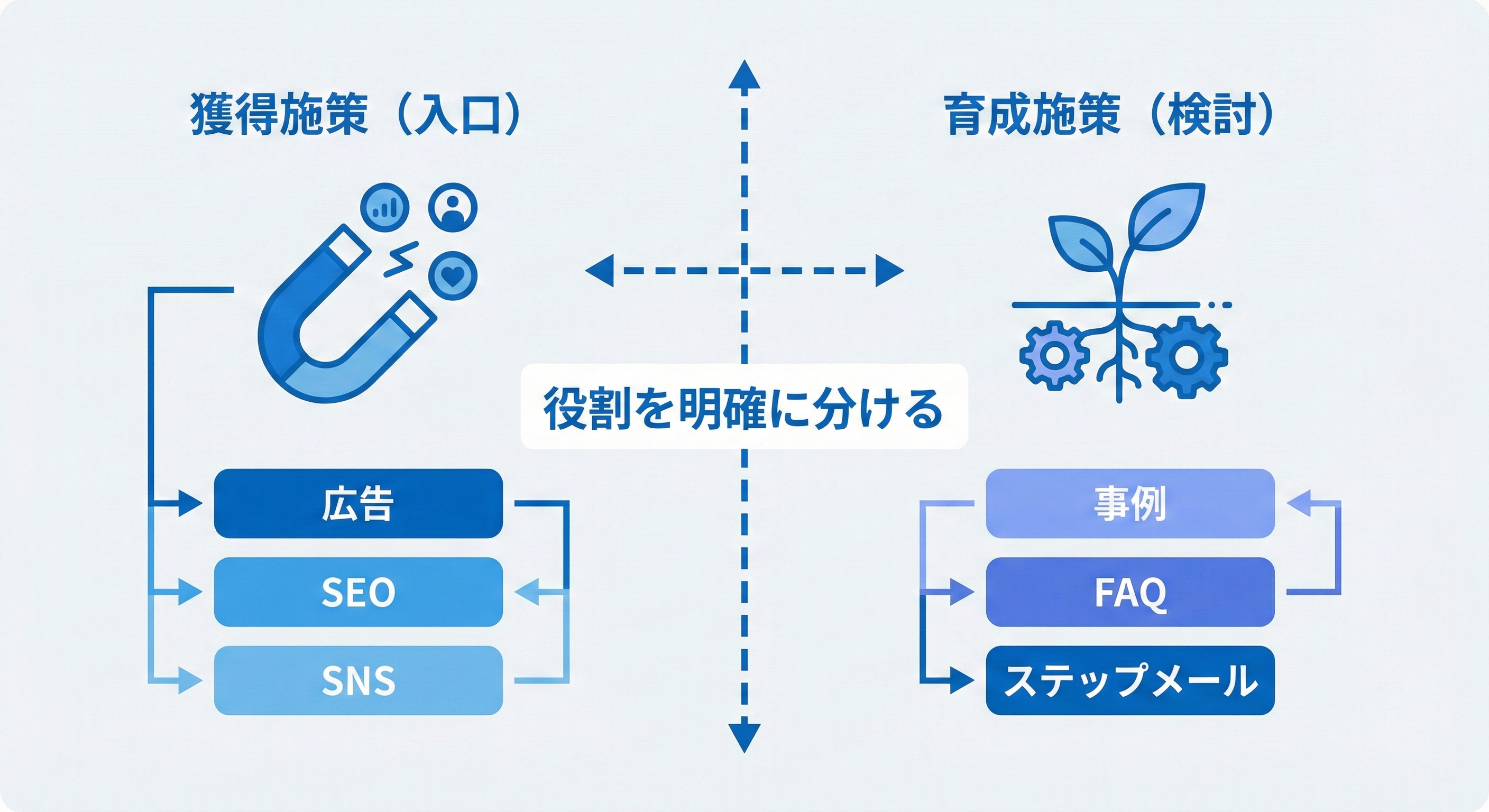 次に、施策を役割で分解します。ポイントは「獲得」と「育成」を分けること。