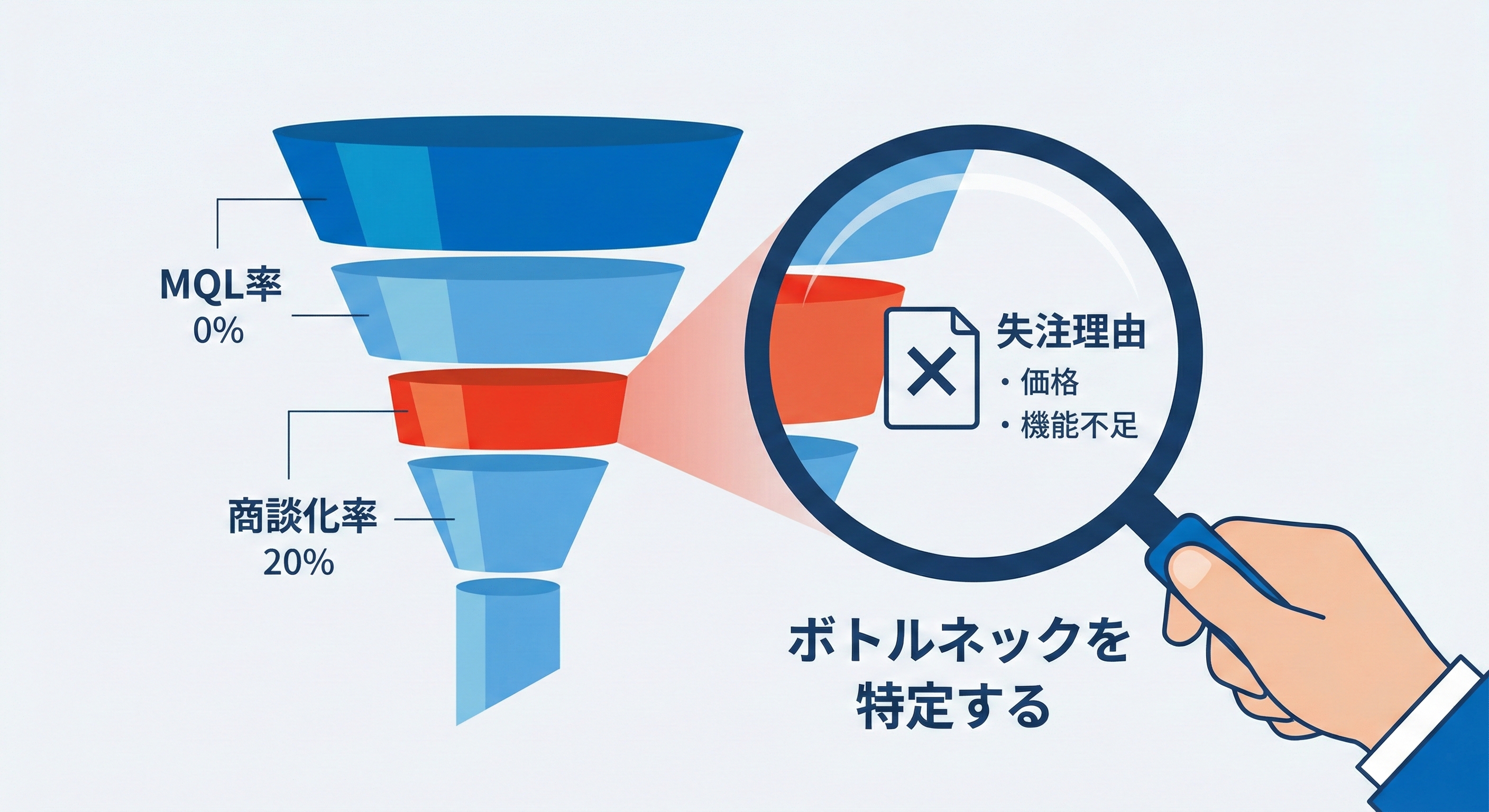 追うべき指標はPVやCVだけではありません。MQL率、商談化率、失注理由の変化を見て、ボトルネックを潰します。