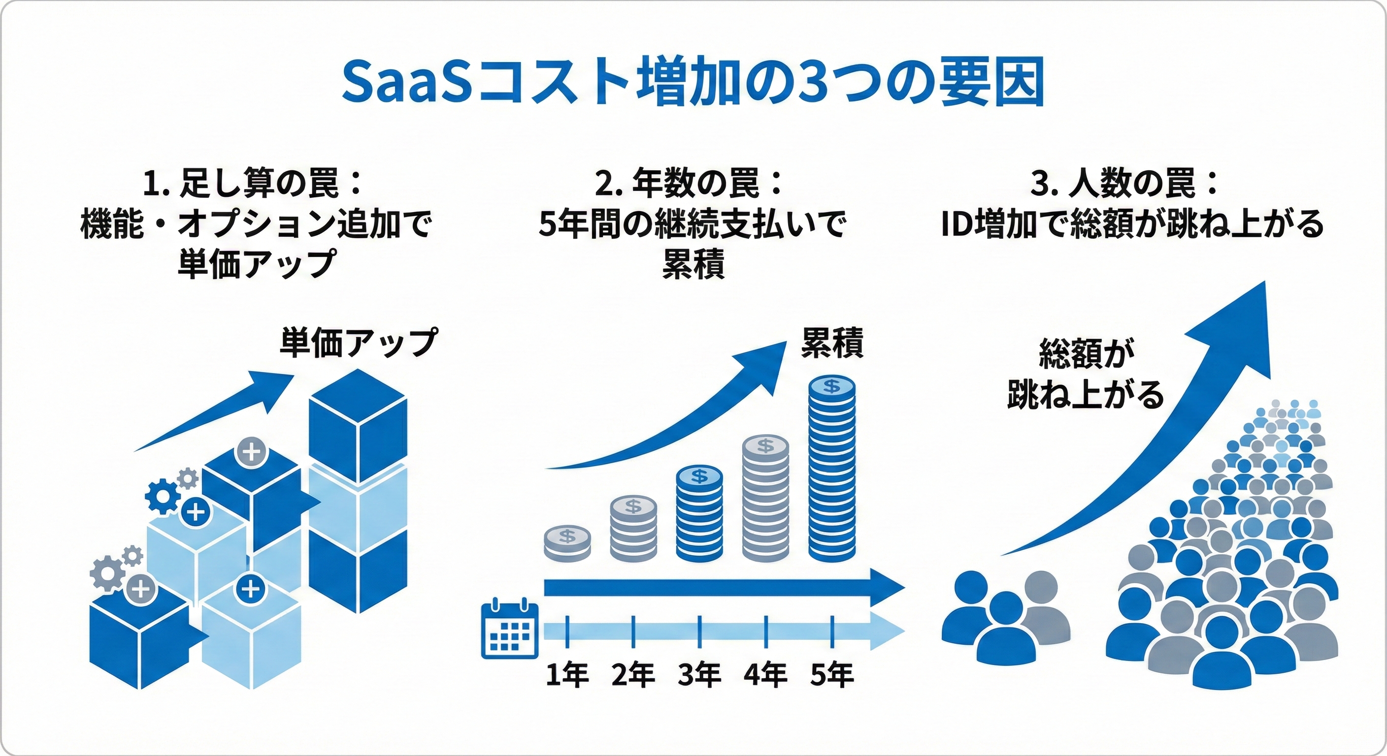 SaaSのコストは、機能追加(周辺SaaSやオプションの追加)、契約期間(年数)、利用者数(ID数)の3要素で増加しやすい傾向があります。