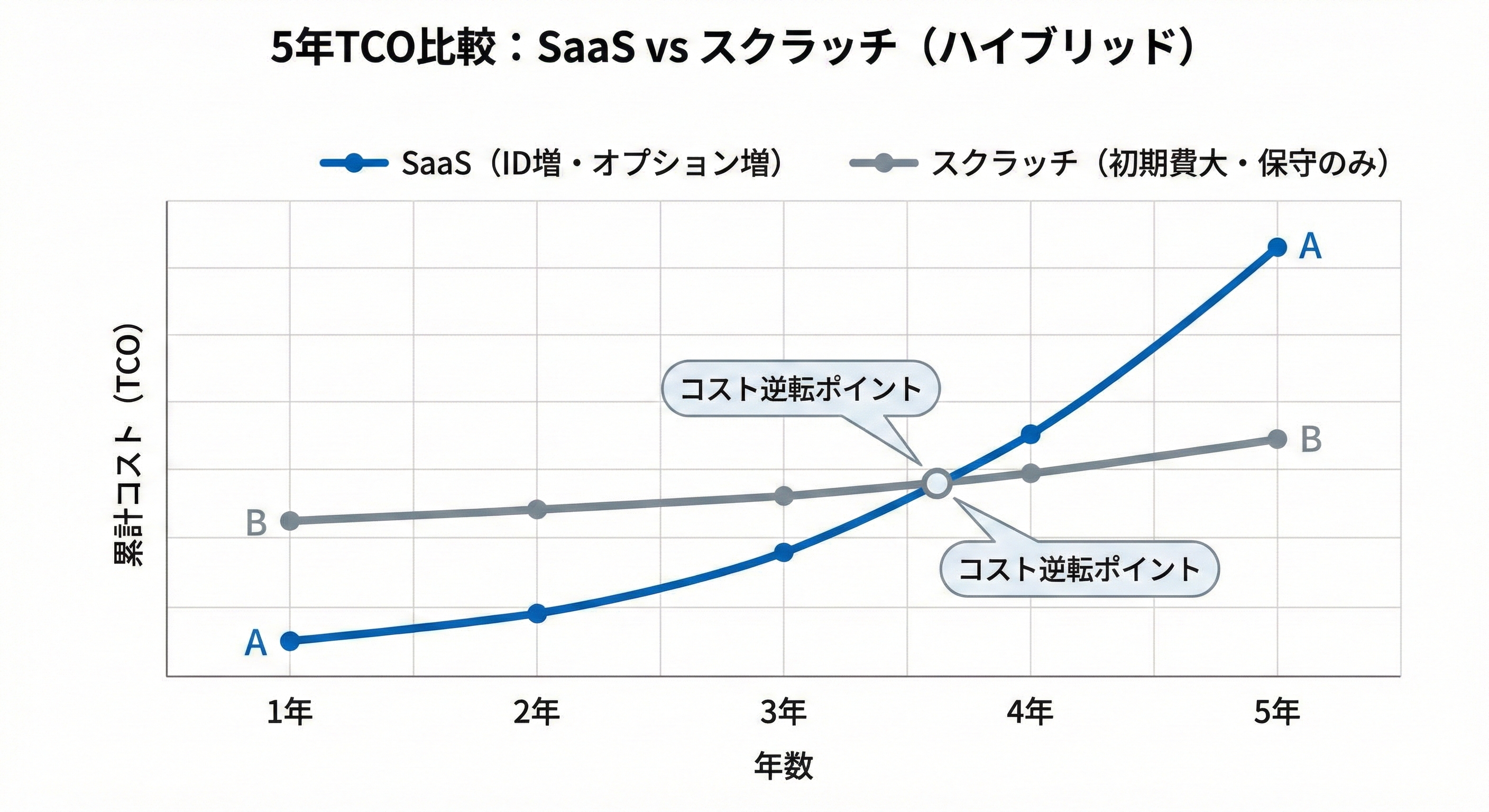 ポイントは、スクラッチを「年次改善枠」を前提に整理すると、投資額を運用しながらコントロールしやすくなる点です。一方でSaaSは、ID増加と機能追加(費目の追加)が、契約期間に応じて総額へ反映されやすい構造差があります。