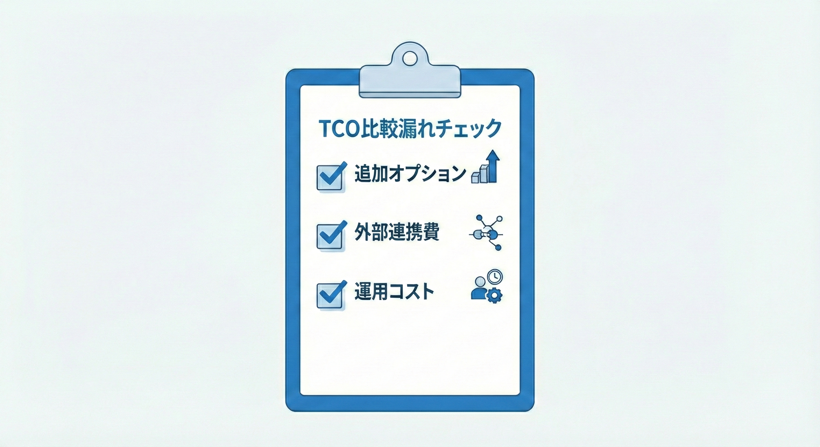 比較時に抜けやすい論点は、オプション費用、外部連携(実装と運用)、運用コスト(社内工数を含む)の3点です。