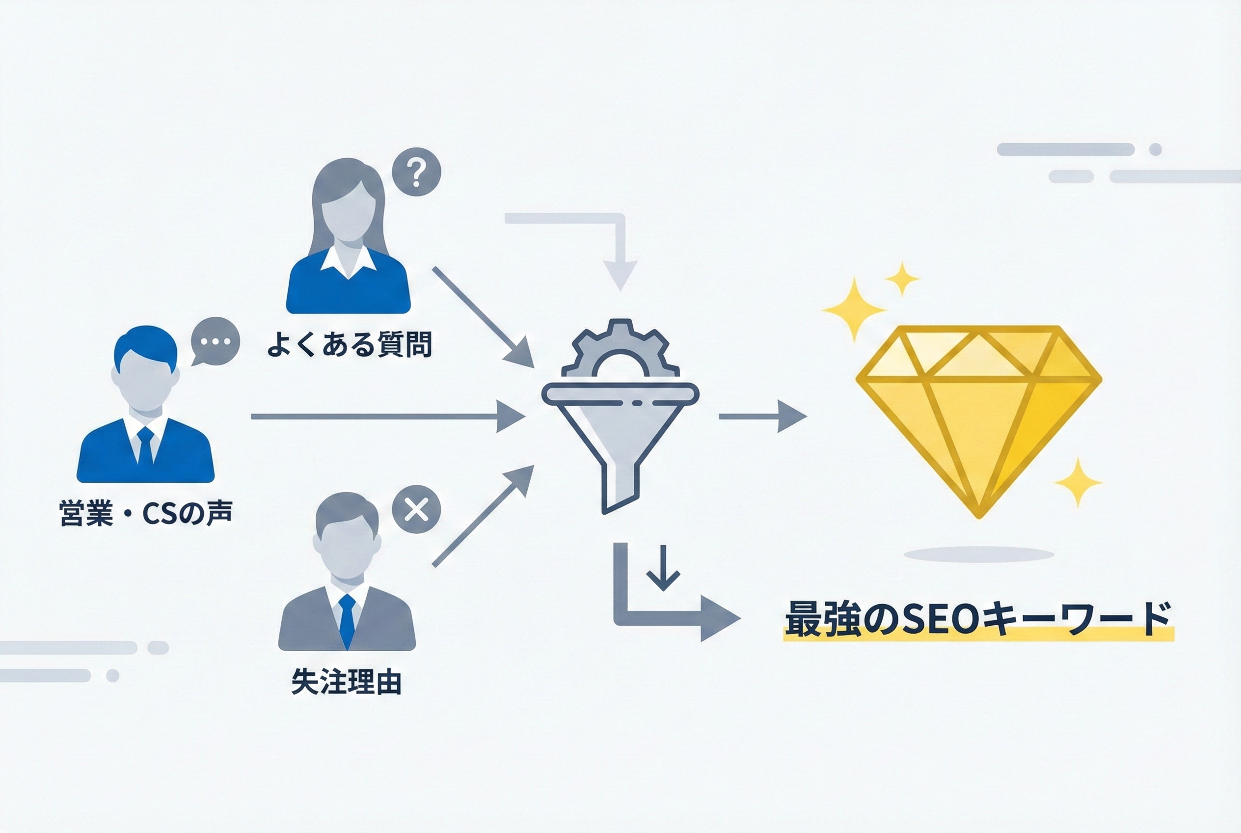 勝てるテーマの多くは、営業・CS・開発の現場にあります。ユーザーが実際に困っていること、比較で迷っていることは、そのまま検索されます。