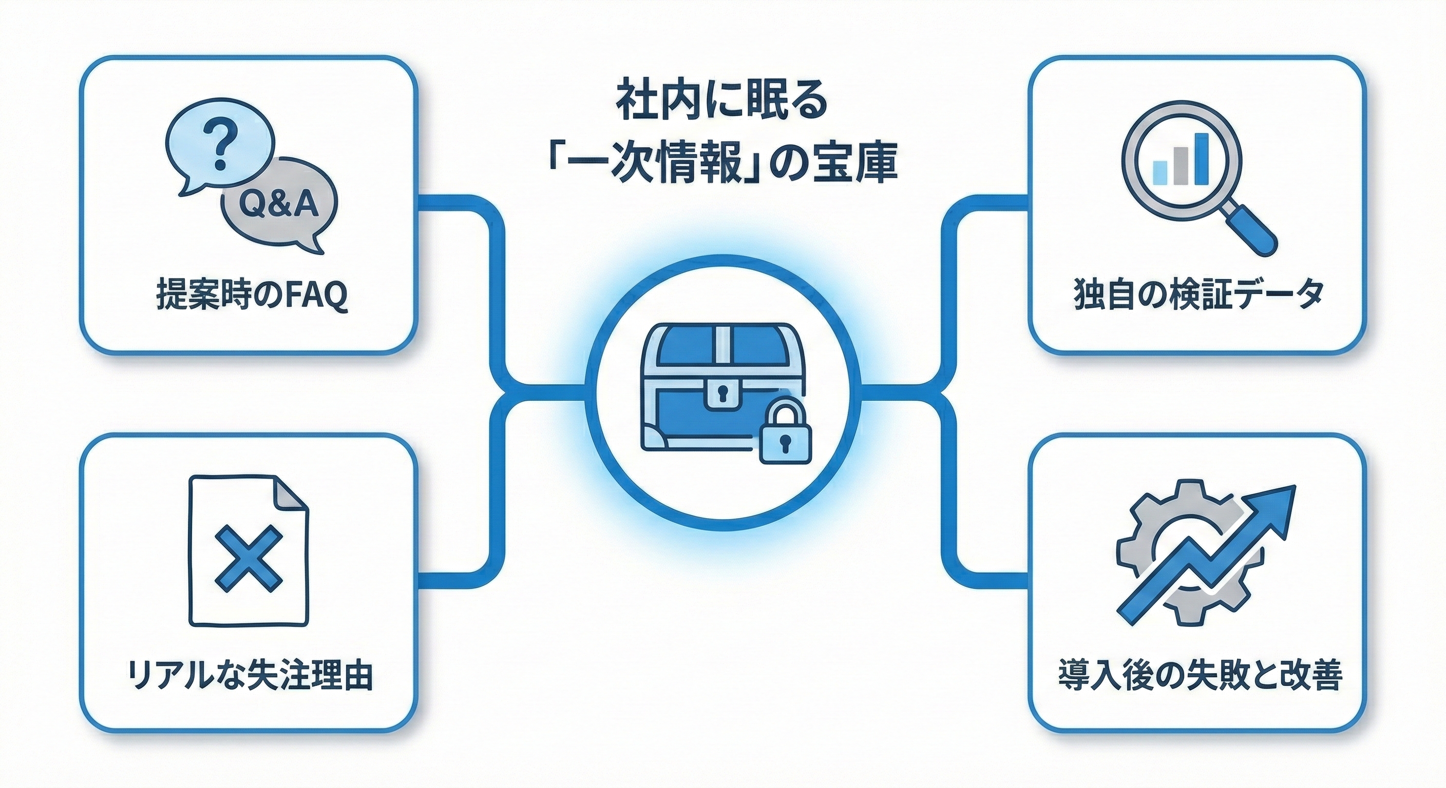 不要です。BtoBでは「社内の現場に眠っている材料」を掘り起こす方が現実的で、差別化にも直結します。たとえば「提案時に必ず聞かれる質問」「失注理由」「導入後のつまずき」「検証結果」「失敗→改善のプロセス」などは、そのまま一次情報になります。さらに、数字や条件が具体的なほど一次情報として強くなります。