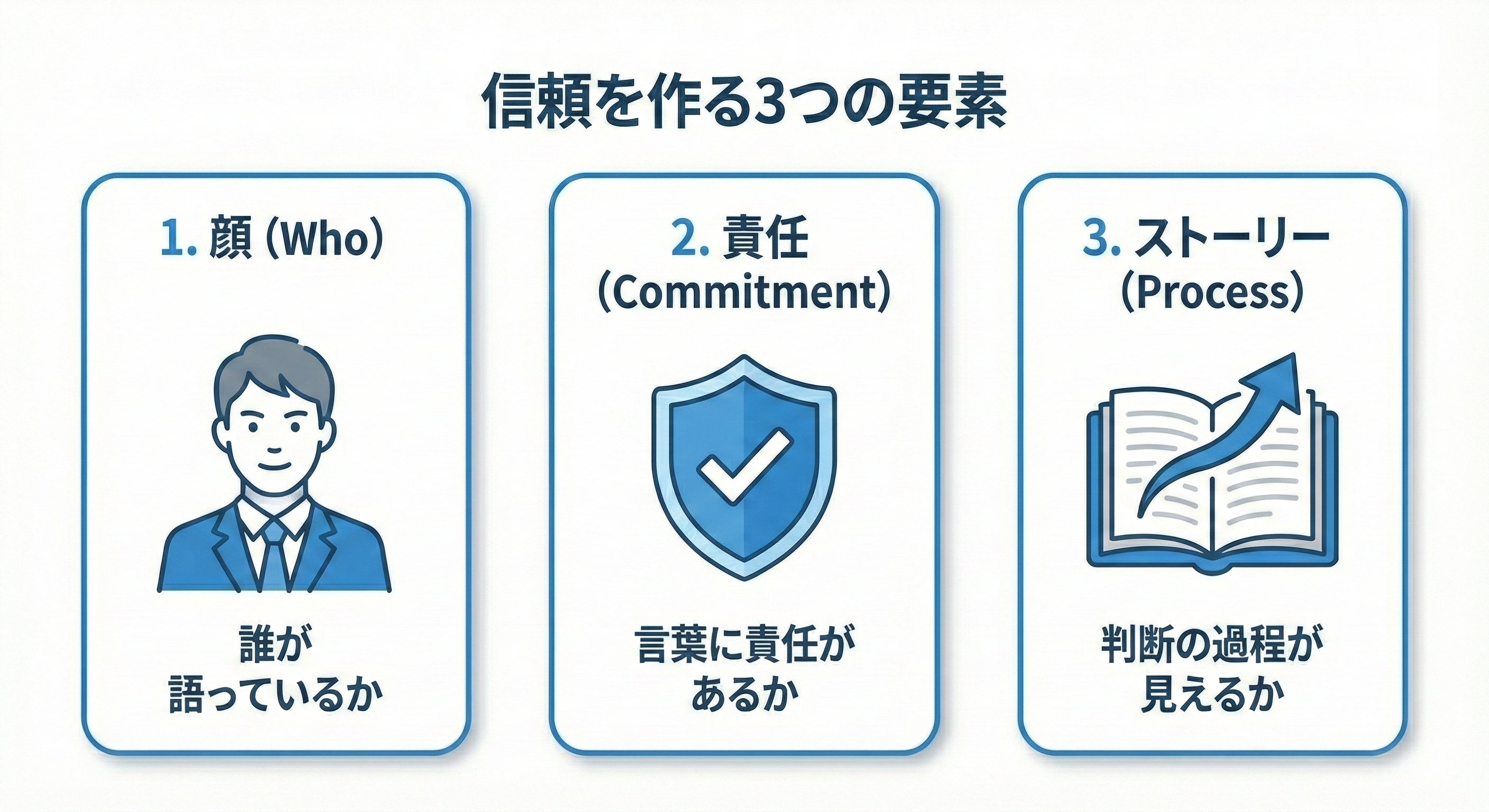 一次情報の価値を高めるのは「提示の仕方」です。信頼は次の3要素で強化できます。