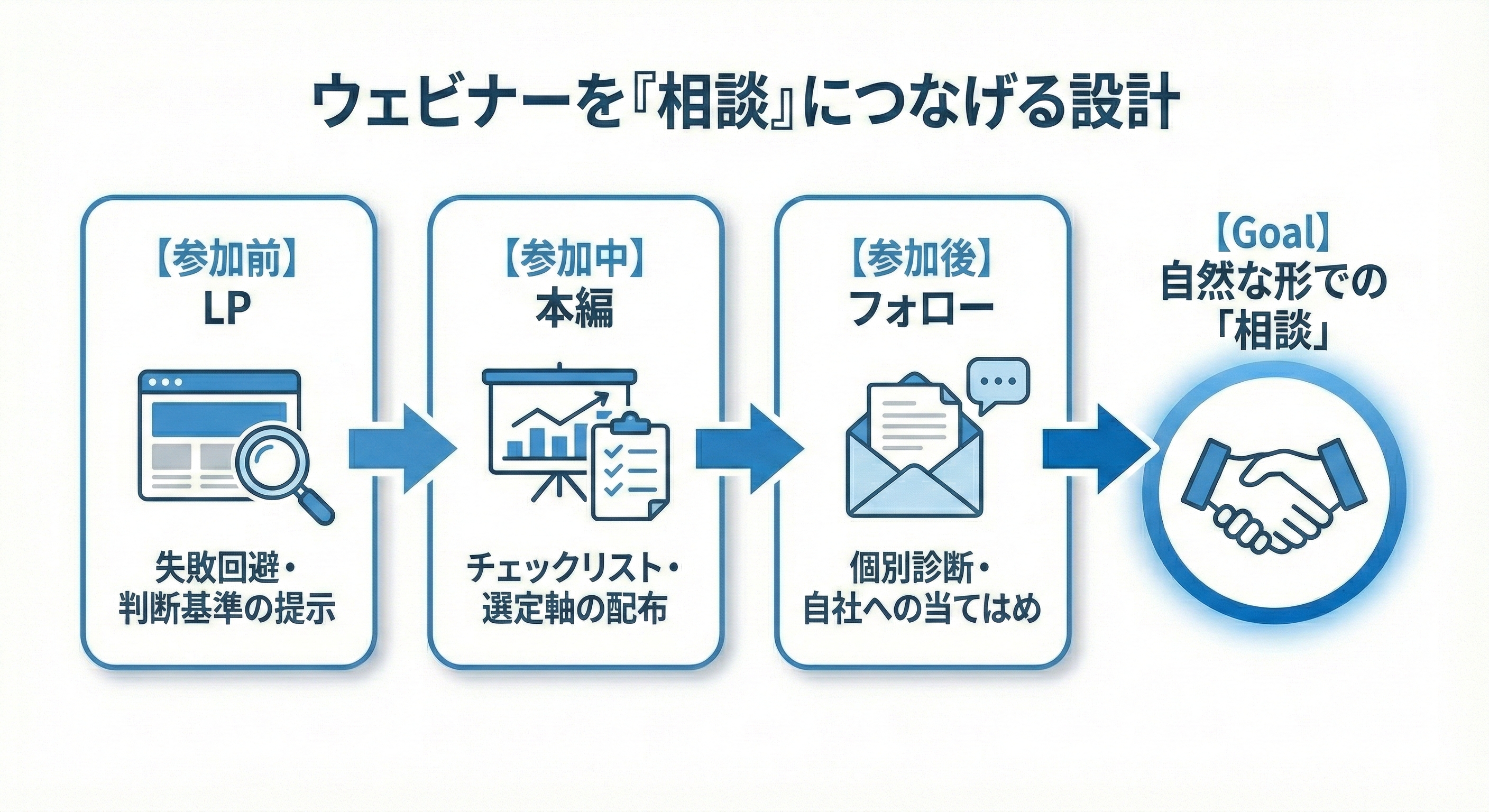 ウェビナーは実施するだけでは商談につながりません。相談につなげるには、前・中・後で役割を分け、次の行動が自然に発生する設計にします。