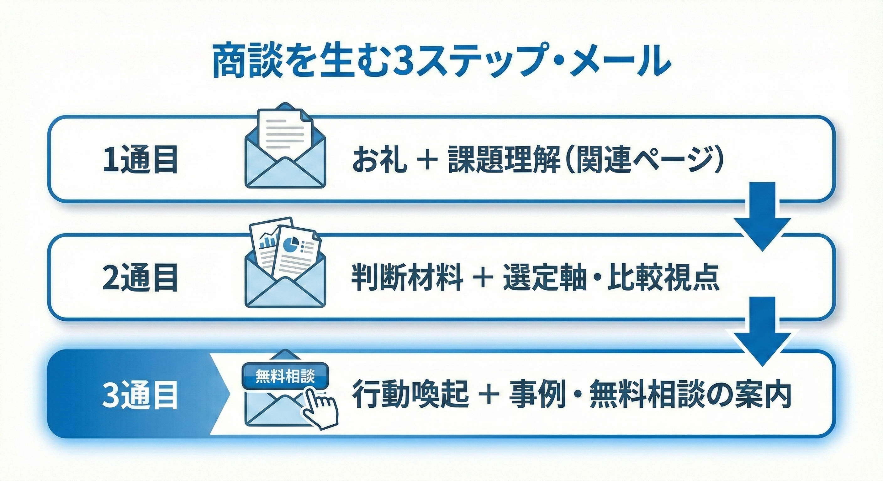 - KPI(重要業績評価指標):開封率だけで判断せず、クリック率、相談率、商談化率、失注理由の変化など「検討が進んだか」を確認します。