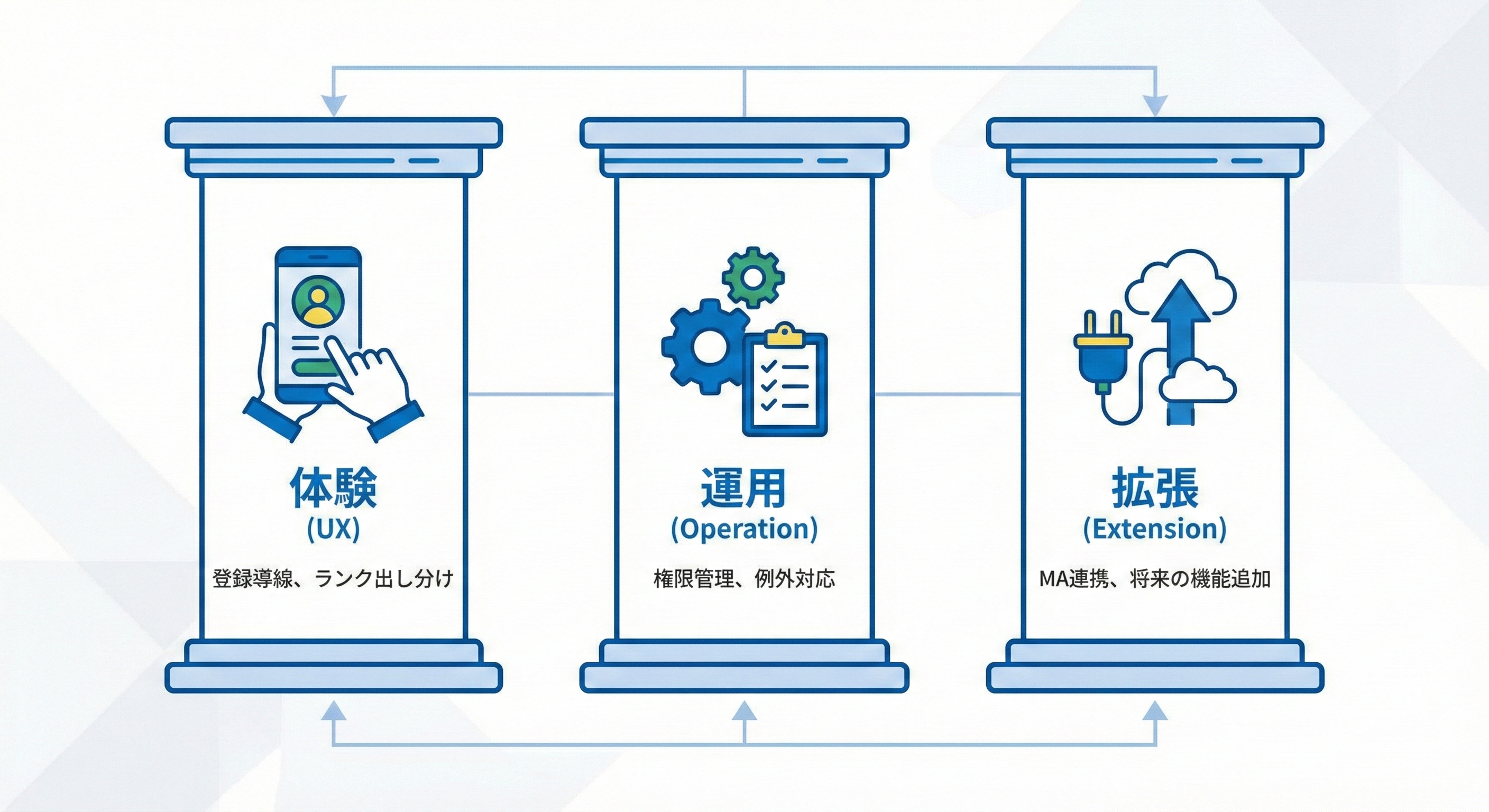 - 拡張:CRM/MA・決済・基幹などの連携、施策改善(A/B等)、将来追加