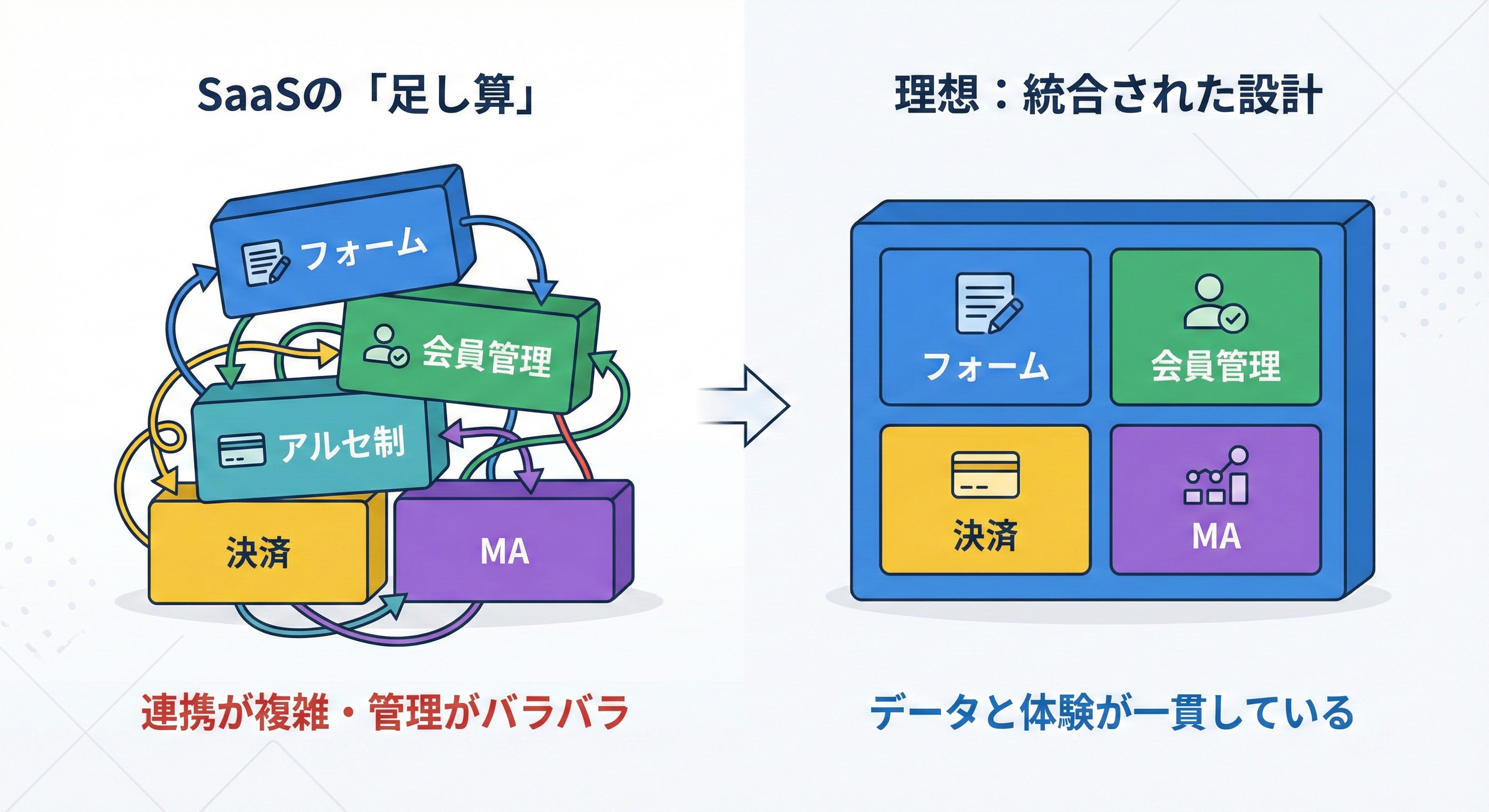 一方、会員サイトのように“周辺機能が増えていく”領域では、SaaSを足していくと統合が難しくなります。