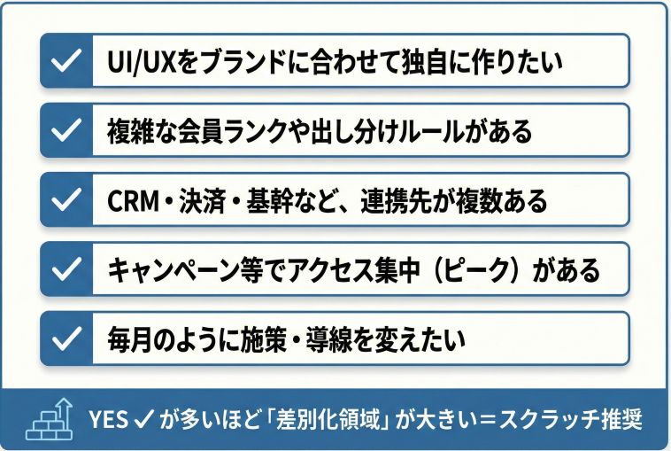 スクラッチは自由度が最大で、会員サイトが求めがちな「独自性」や「拡張」に強いです。