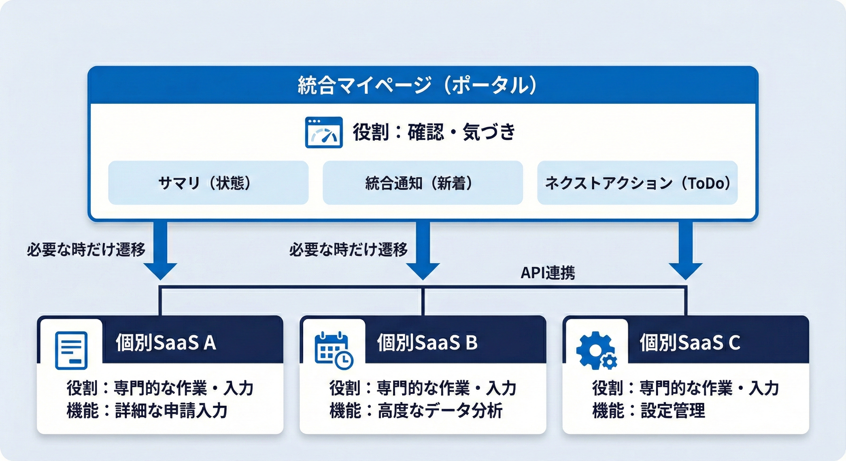 「確認」はポータルで完結させ、「作業」が必要な時だけ各サービスへ遷移させる。この分担こそが、実装コストを抑えつつUXを最大化するポイントです。