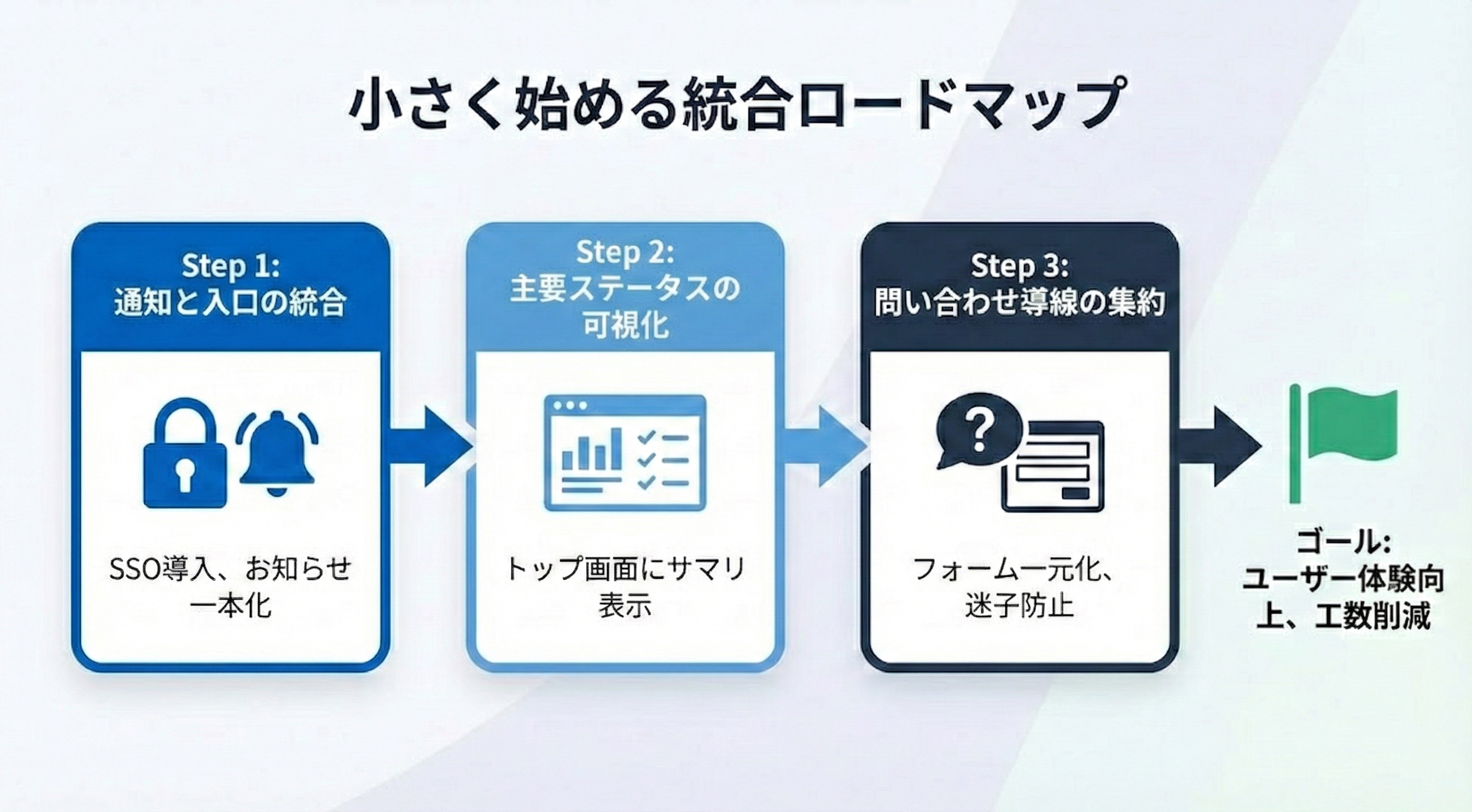 最初から完璧なフル統合を目指す必要はありません。ユーザーメリットが大きく、社内合意も取りやすい領域から「小さく始める」のが成功への近道です。