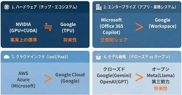 本レポートでは、GoogleとOpenAI(Microsoft連合)を中心としたAI市場の競争構造を、ハードウェア、エンタープライズ、クラウド、オープンソースの4つの視点から分析します。また、第三勢力の台頭がもたらす市場への影響を考察します。