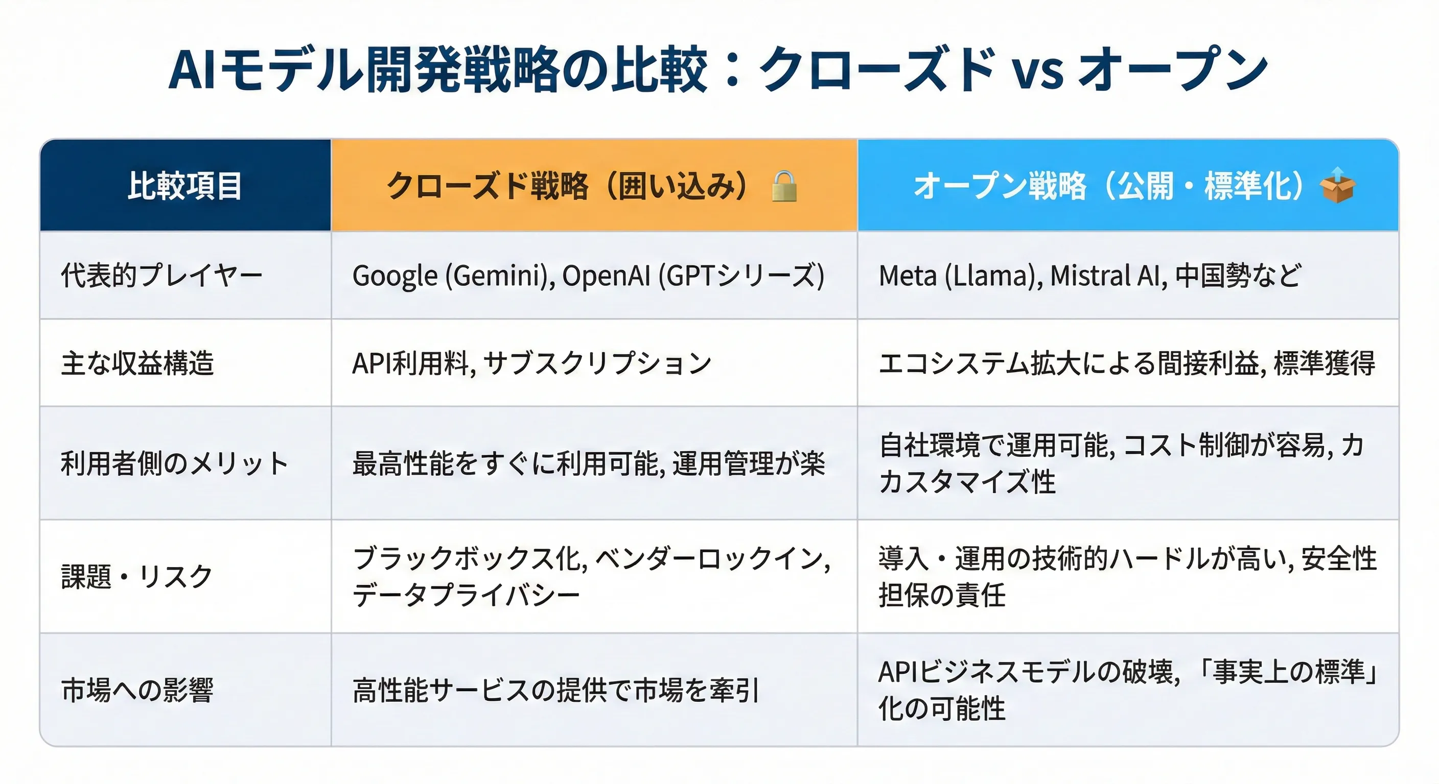 AIモデルの提供方法には、技術を自社で囲い込む「クローズド」な戦略と、広く一般に公開する「オープン」な戦略という、二つの大きな流れが対立しています。どちらが主導権を握るかによって、将来私たちがAIを利用する際のコストや、技術がどこまで自由に使えるようになるかが大きく変わってくるでしょう 。
