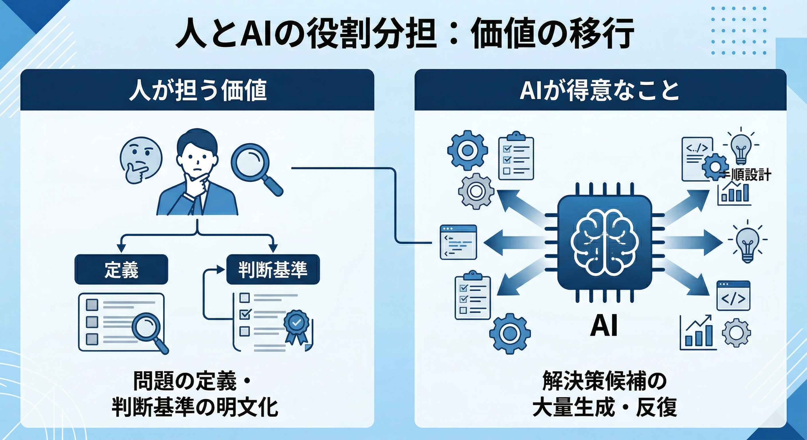 この不安を打ち消すためには、楽観論を語るよりも、変化を受け止めたうえで「人が担う価値をどこに置くか」を設計し直すべきだと考えています。AIが得意なのは、一定の条件がそろった問題に対して、解決策の候補を大量に出し、反復を速く回すことです。逆に人が担うべきは、条件をそろえる前段にある「問題の定義」や「判断基準の明文化」です。