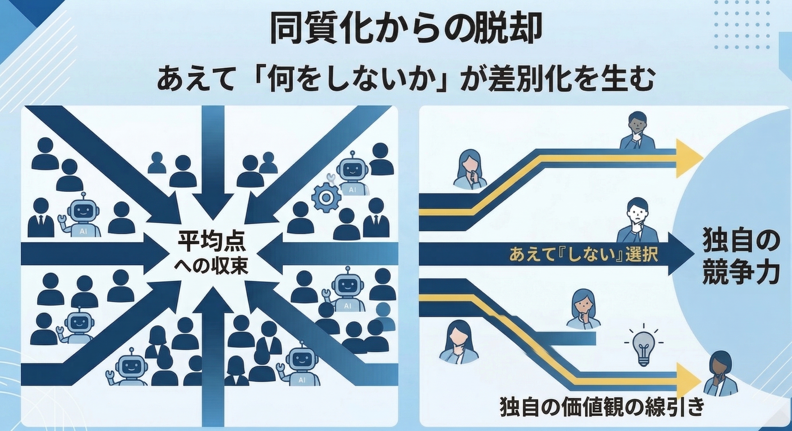 AIが普及すると、この傾向はさらに強まります。ベストプラクティスが高速に共有され、もっともらしい結論が誰でも作れるようになるからです。結果として、正しさを積み上げた先で、どこも似た意思決定になりやすくなります。