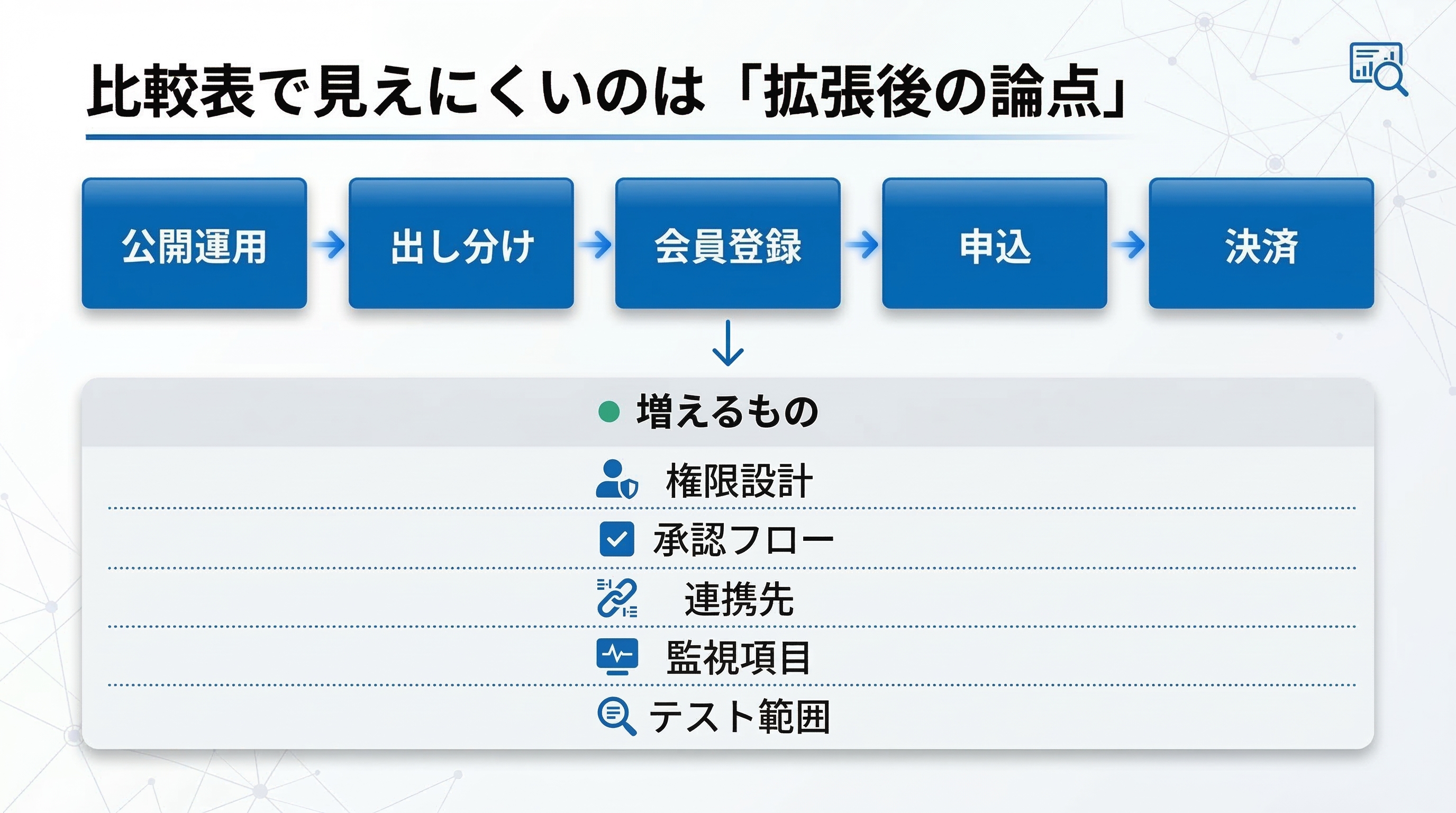 最後に、拡張が進むと増えやすい論点を列挙します。増える対象が見えるほど、計画段階の合意が取りやすくなります。