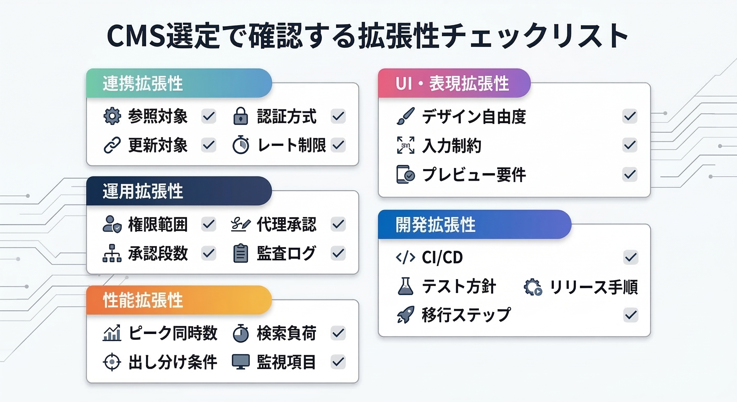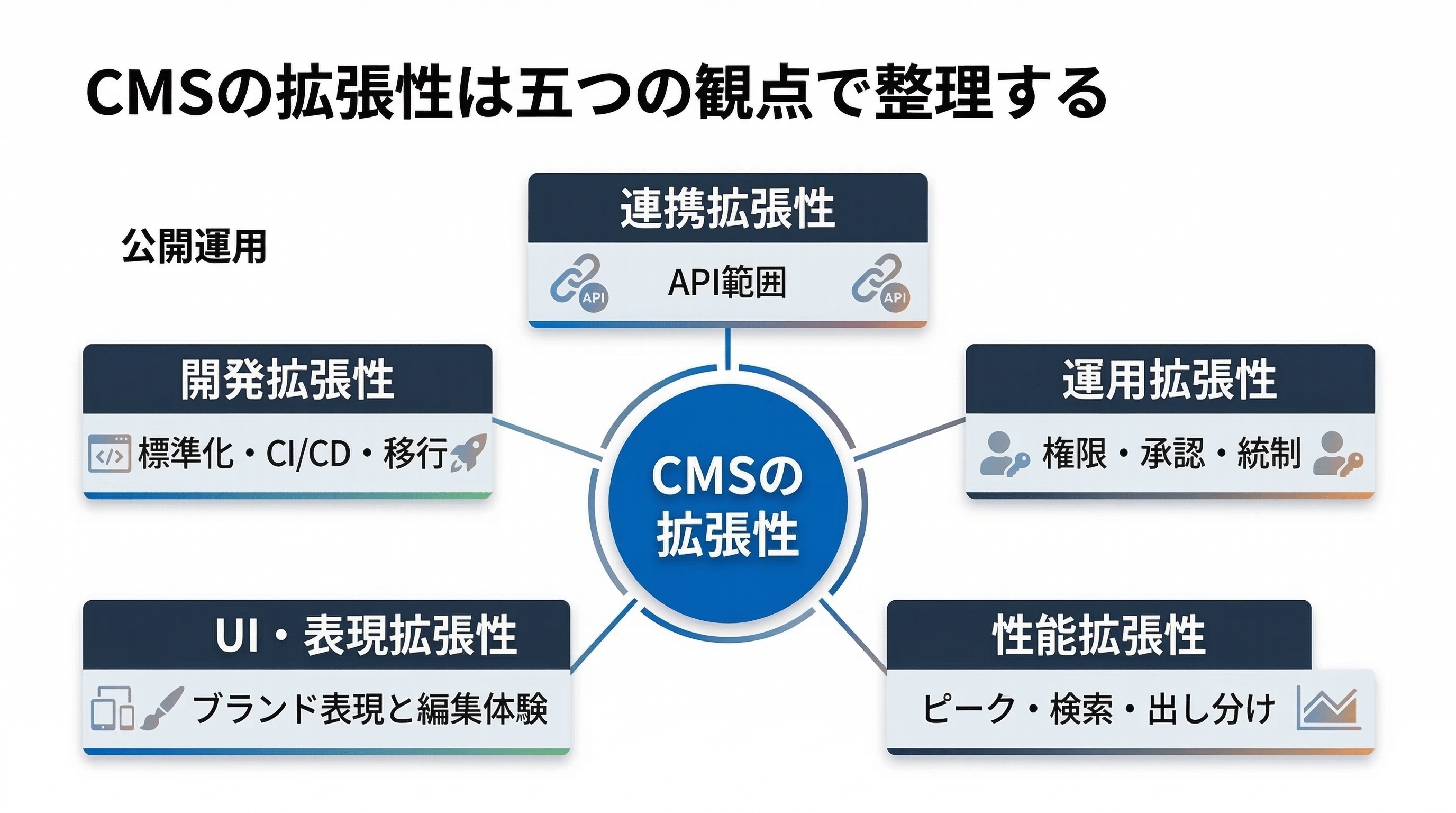ここでは、意思決定に使えるように、拡張性を次の五つへ分けます。必要な専門語には短い補足を付けます。