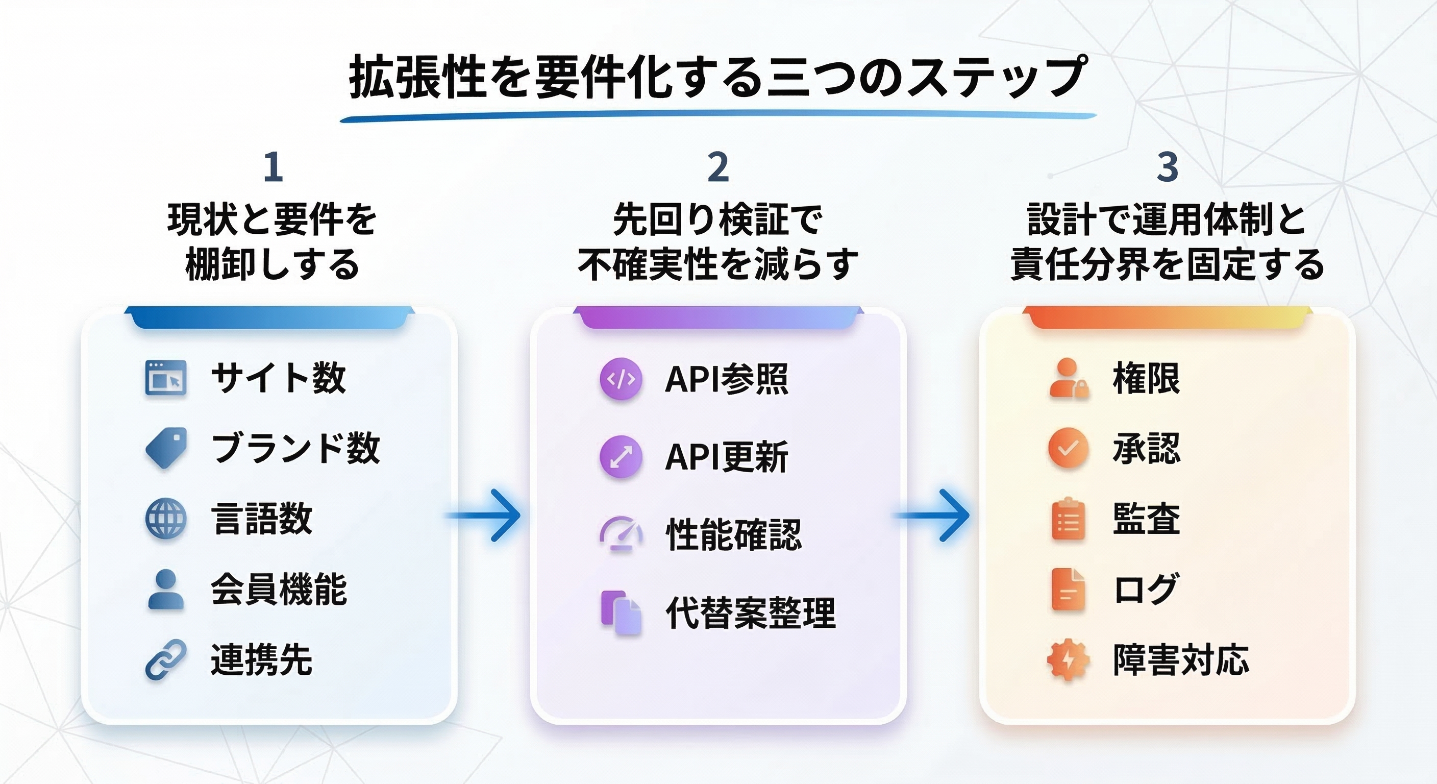 拡張性を議論しても、進め方が曖昧だと判断が先送りになります。次の順序で進めると、上振れ要因が見えやすくなります。