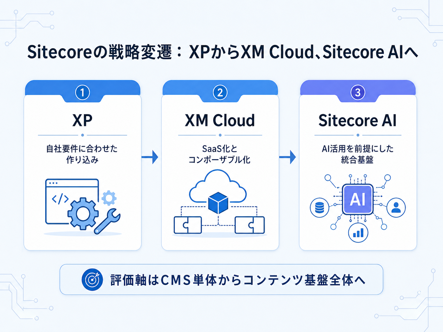 Sitecoreを現在の視点で正しく評価するには、まずXPからXM Cloud、そしてSitecore AIへと続く流れを整理する必要があります。