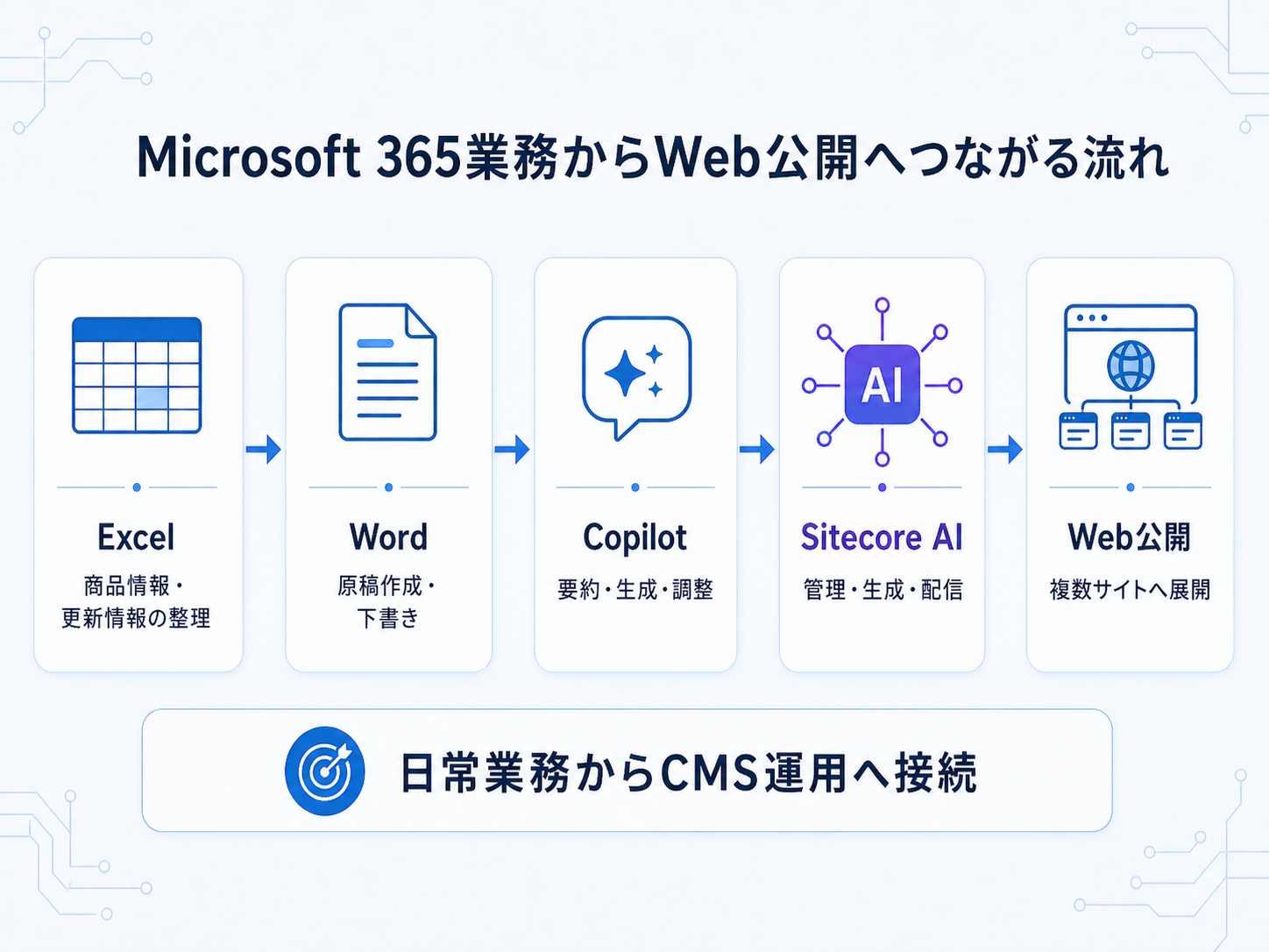 ここにCopilotやMicrosoftのAI機能が入り、さらにその流れがSitecoreへ自然につながるのであれば、AI活用は一気に現実的になります。Excelで更新していた内容をそのままWeb公開フローへ接続したい、Wordで作った原稿をコンテンツ管理と連動させたい、というニーズは大企業ほど多く見られます。