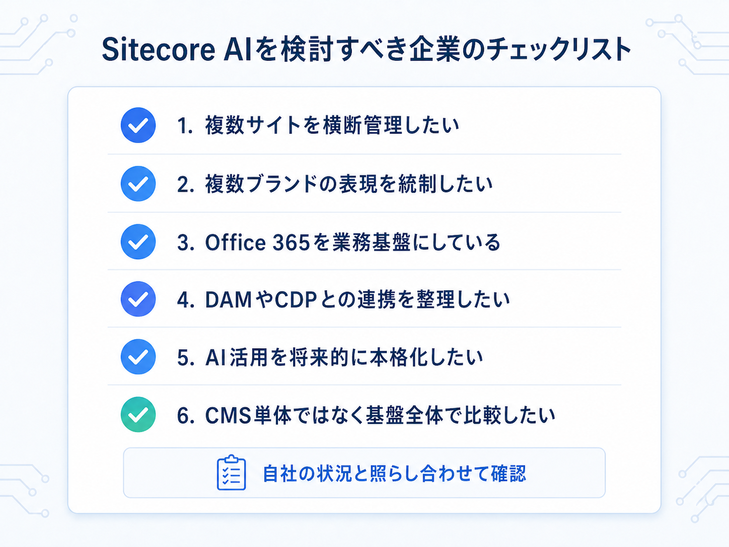 特にBtoB企業や大企業では、Office 365がベースになっていることが多く、個別機能で他ツールが優れていたとしても、全社の業務環境まで含めるとMicrosoft寄りの判断になることがあります。Sitecore AIは、企業側の判断構造と相性がよい製品です。